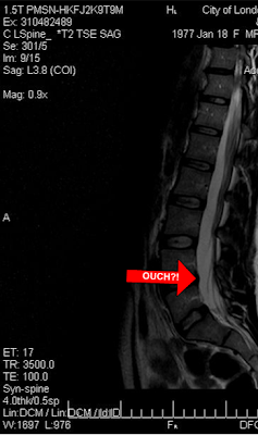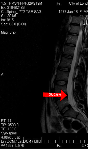 A few weeks in, I'm no better, and my physio, who is a spine specialist, is encouraging a second opinion because he and several of his colleagues think that the bump highlighted in the picture is the cause of my woes. That's where a disc appears to be pressing on my nerve.