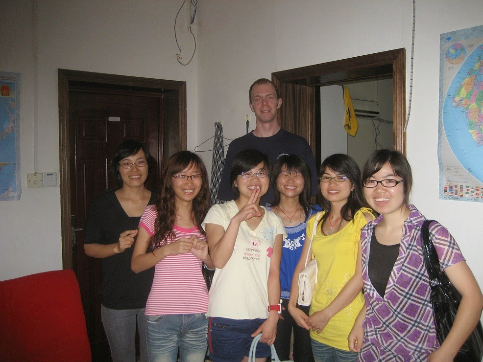 A group of my brother's students and scheduled to come by to say goodbye and to give him a gift, and right on time at 1030, there was a knock at the door from a gaggle of girls. They came bearing a few extremely thoughtful gifts: a Chinese knot for good luck, some calligraphy, and a small notebook in which members of the class had each written a well-wishing note. Among my favorite notes were one where a student mentions Kiely's left handedness (students in China are required to be right handed) and another which spoke of his, “golden eyelashes”. This gave me plenty of material to tease him.