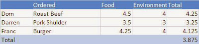 - The Roast: Roast beef, roast potatoes, parsnips, yorkshire pudding, gravy (Dom, Franc)